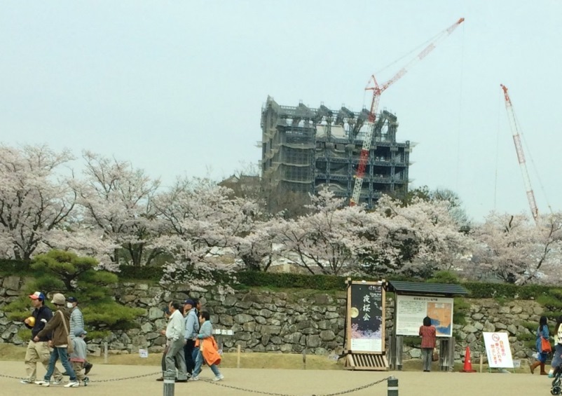 COMMENT花冷え・寒気もあって、まだ満開です。 お花見を予定していた人達には、あいにくの週末でした。 春爛漫も行ったり来たりで、今朝などは「霜」が下りていました。 車の窓からの撮影ですが、お城はご覧のとおり檻の中です。