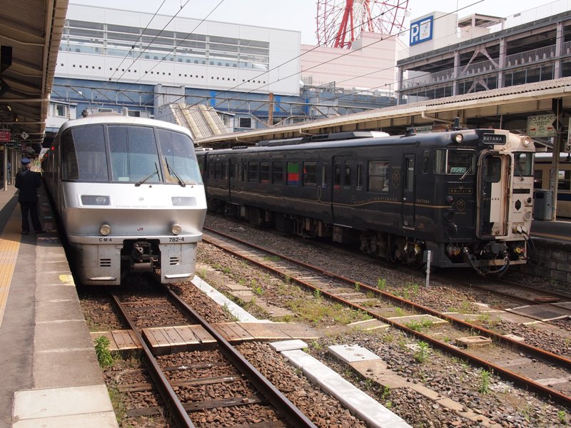 COMMENT左が783系きりしま、右がいぶすきのたまて箱です。 いぶたまは、純編成のキハ47系です。 進行方向山側が黒色、海側が白色となります。 きりしまの前の列車が、はやとの風でした。 キハ147系なんですが、いぶたま増編用車両の混編成でした。 乗れた人はラッキーでしたね。 |