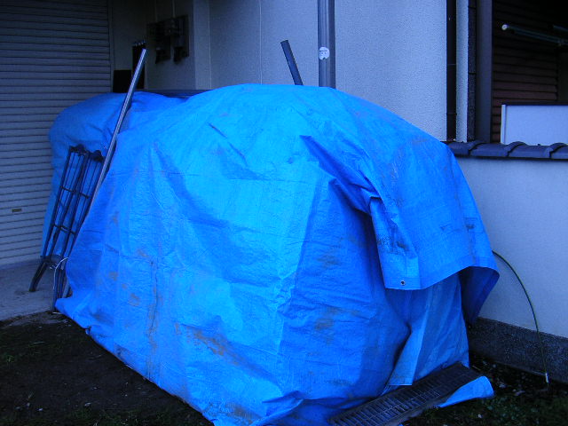 人目を避けて隠していいるわけではないのだけれど、雨よけにブルーシートを掛けています。今年から無化学肥料栽培にチャレンジということで「鶏糞」を200袋購入しました。10袋に1袋のおまけで220袋が配達されました。